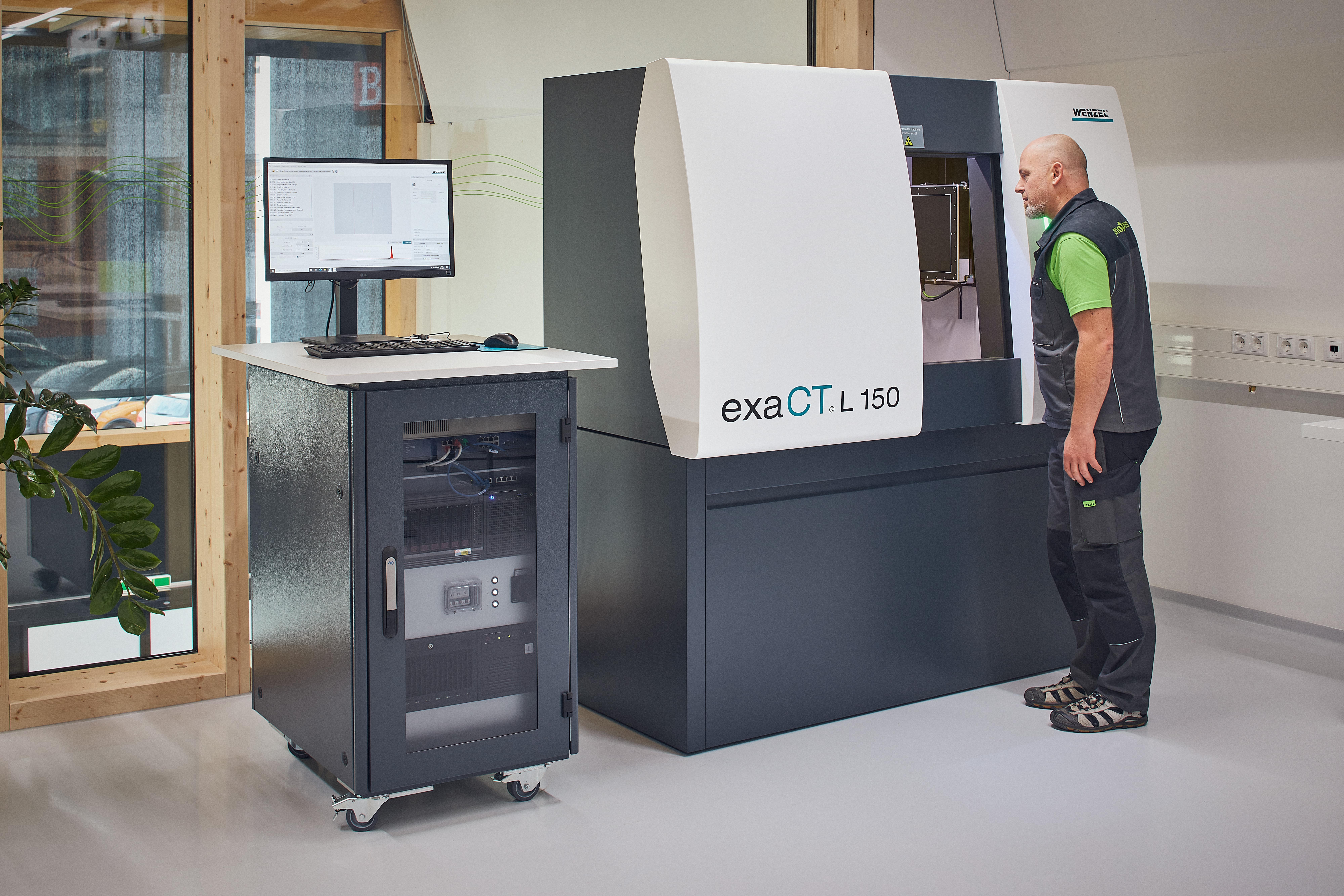 Darüber hinaus hat die CT-Lösung von WENZEL die kleinste Stellfläche in ihrer Klasse mit 150 kV und bietet zudem ein Scanvolumen von 400 mm in der Höhe und 235 mm im Durchmesser. „Der Wunsch nacheinem möglichst großem Messvolumen bei vergleichsweise kleiner Maschinenbauart war ein weiteres wichtiges Anforderungskriterium“, betont Humml. Neben der kleinen Stellfläche und dem großen Scanvolumen bietet das exaCT L einen weiteren großen Vorteil – der Transport und Aufbau verlangt keine Durchbrüche von Türen und Gängen, was eine schnelle und reibungslose Installation ohne Mehraufwand sichert. Auch in Puncto Systemgewicht ist der exaCT L Klassenbester, mit nur 2.650kg, was eine Flexibilität der Aufstellplätze ermöglicht.