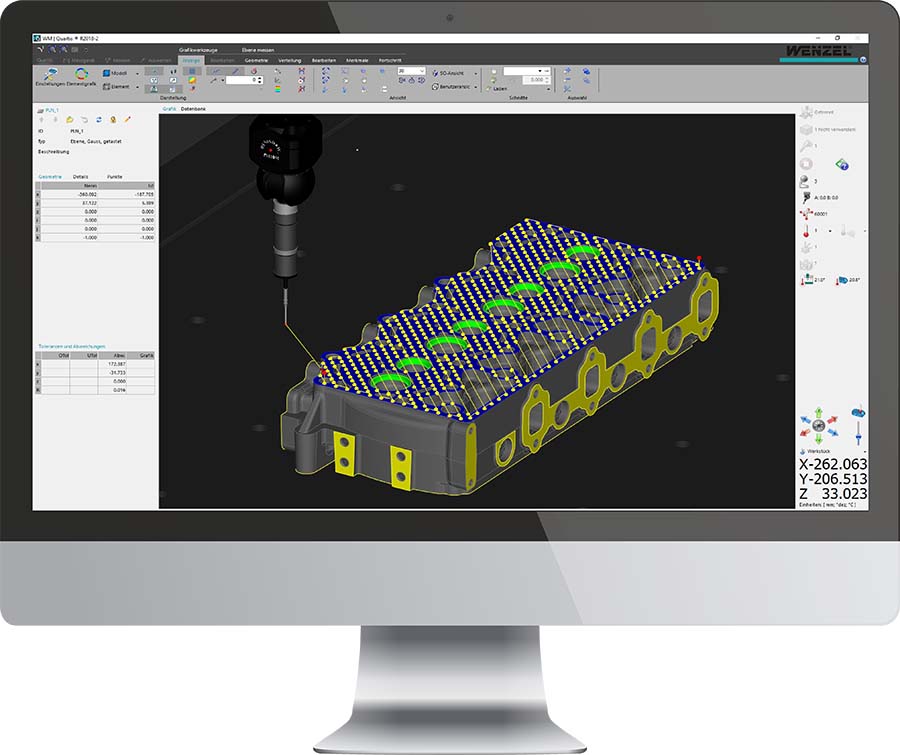 „Im Mittelpunkt des Gesamtkonzeptes bei Deutz steht die 3D-Koordinatenmessmaschine LH 1210 von WENZEL“, erklärt Klostermann. „Ein CNC-Portalmessgerät für schaltende, messende und optische sowie indexierte Tastsysteme. Eine dynamische und hochpräzise Maschine.“ Mit Messbereichen von 2.000 Millimetern in der X-, 1.200 Millimetern in der Y- und 1.000 Millimetern in der Z-Achse sowie einer Belastbarkeit von 2.300 Kilogramm nimmt sie mühelos auch ganze Motorblöcke auf. Über diese für die DEUTZ AG gewählten Dimensionen hinaus gibt es die WENZEL LH 1210 auch mit Messbereichen bis 8.000 Millimetern in der Y-Achse sowie Belastbarkeiten bis 3.250 Kilogramm. „Mit der WENZEL LH 1210 erreicht DEUTZ eine Längenmessabweichung von MPEe = 2.2 μm“, präzisiert Klostermann. „Ausgerüstet ist sie mit einem PH10M-Dreh-/Schwenkkopf sowie SP25-Messtaster von Renishaw – und zusätzlich mit dem optischen 3-D-Linienscanner SHAPETRACER von WENZEL.“ „Die neuen Möglichkeiten durch den Dreh-Schwenkkopf und vor allem durch den Linienscanner katapultieren uns natürlichi n ganz andere Sphären“, freut sich Kersting. So lassen sich dank des beweglichen Kopfes jetzt auch komplexe Prüfabläufe mit Messpunkten in verschiedenen Lagen ohne Angst vor Kollisionen zügig absolvieren. „Wir sparen hier bei bestimmten Bauteilen locker 20 bis 30 Prozent der Zeit“, ist sich Kersting sicher. Und: „Dank des 3-D-Linienscanners können wir jetzt auch die Bauteilgeometrie flächig digitalisieren und wahnsinnig schnell auswerten. Mit der bisherigen, allein taktilen Ausstattung war das gar nicht oder nur mit exorbitantem Aufwand möglich. Geradezu ein Quantensprung für uns.“