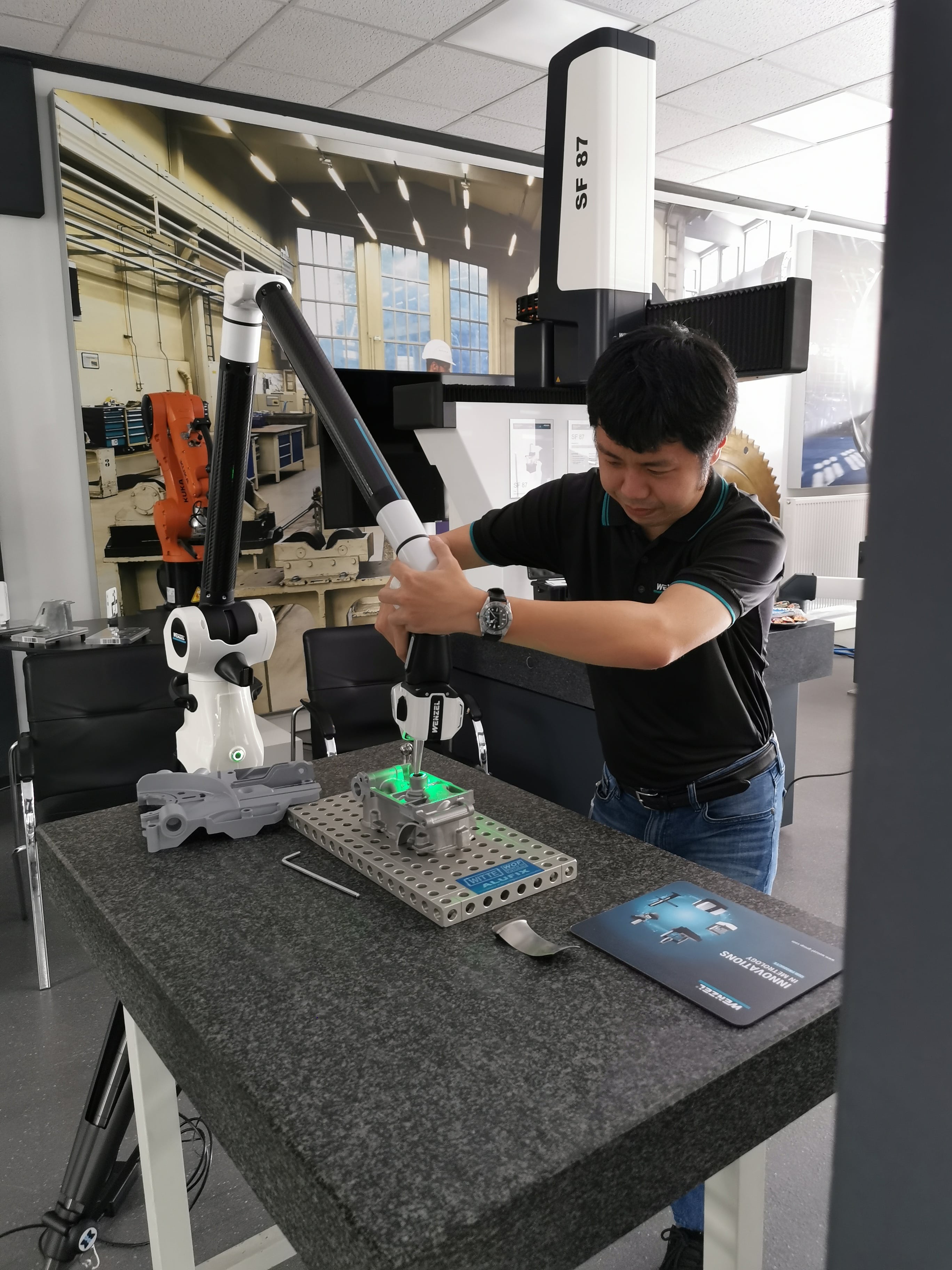Durch die Kombination des portablen 7-Achs-Messarm mit hoch aufl ösenden Linienscannern, die jedes Detail berührungslos erfassen, stellen die Messarme eine gute Ergänzung zu Ihren installierten klassischen Koordinatenmesssystemen dar. Die Verwendung neuster Materialien macht den Messarm zum Leichtgewicht, der im mobilen Einsatz hoch genaue und reproduzierbare Messergebnisse liefert. Ohne Aufwärmzeit und das Kleben von Markern auf dem Bauteil kann der Messarm unmittelbar am Bauteil eingesetzt werden – sowohl mit optischen als auch taktilen Sensoren. Die gewonnen Messergebnisse können im Anschluß über eine WiFi Schnittstelle zur Weiterverwendung übertragen werden. Die Kapazität und der geringe Verbrauch der integrierten Batterie stellen den Betrieb des Messarms über einen längeren Zeitraum verlässlich sicher.